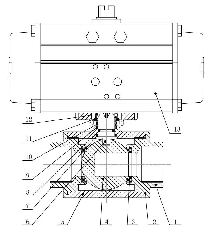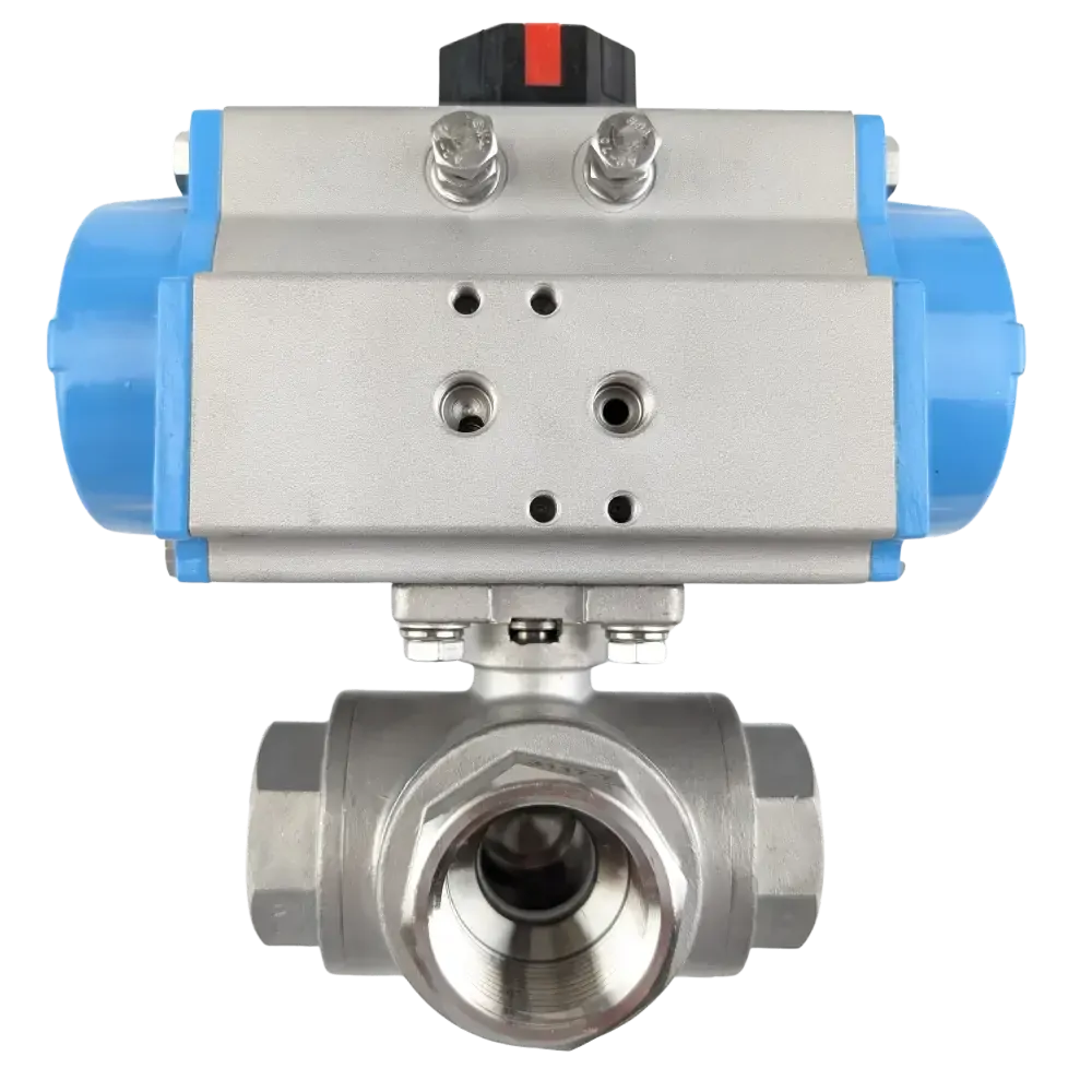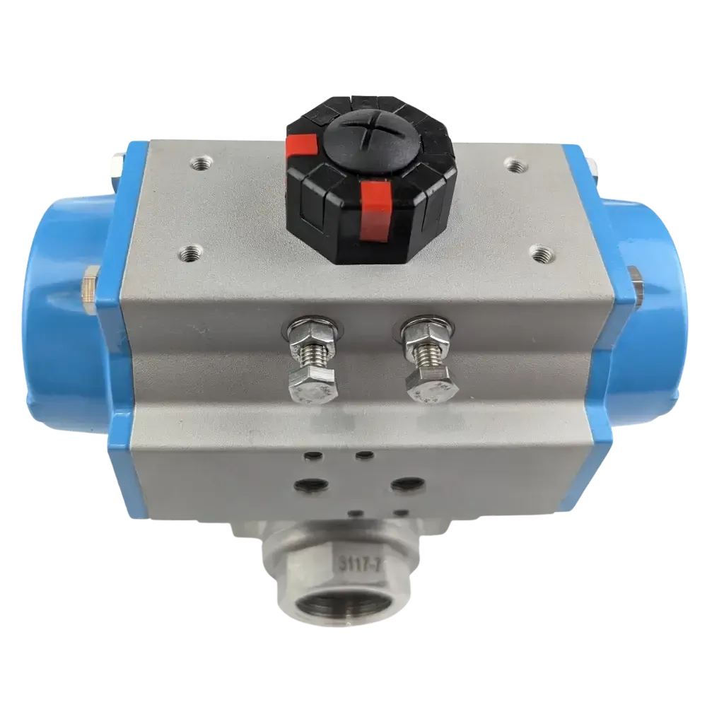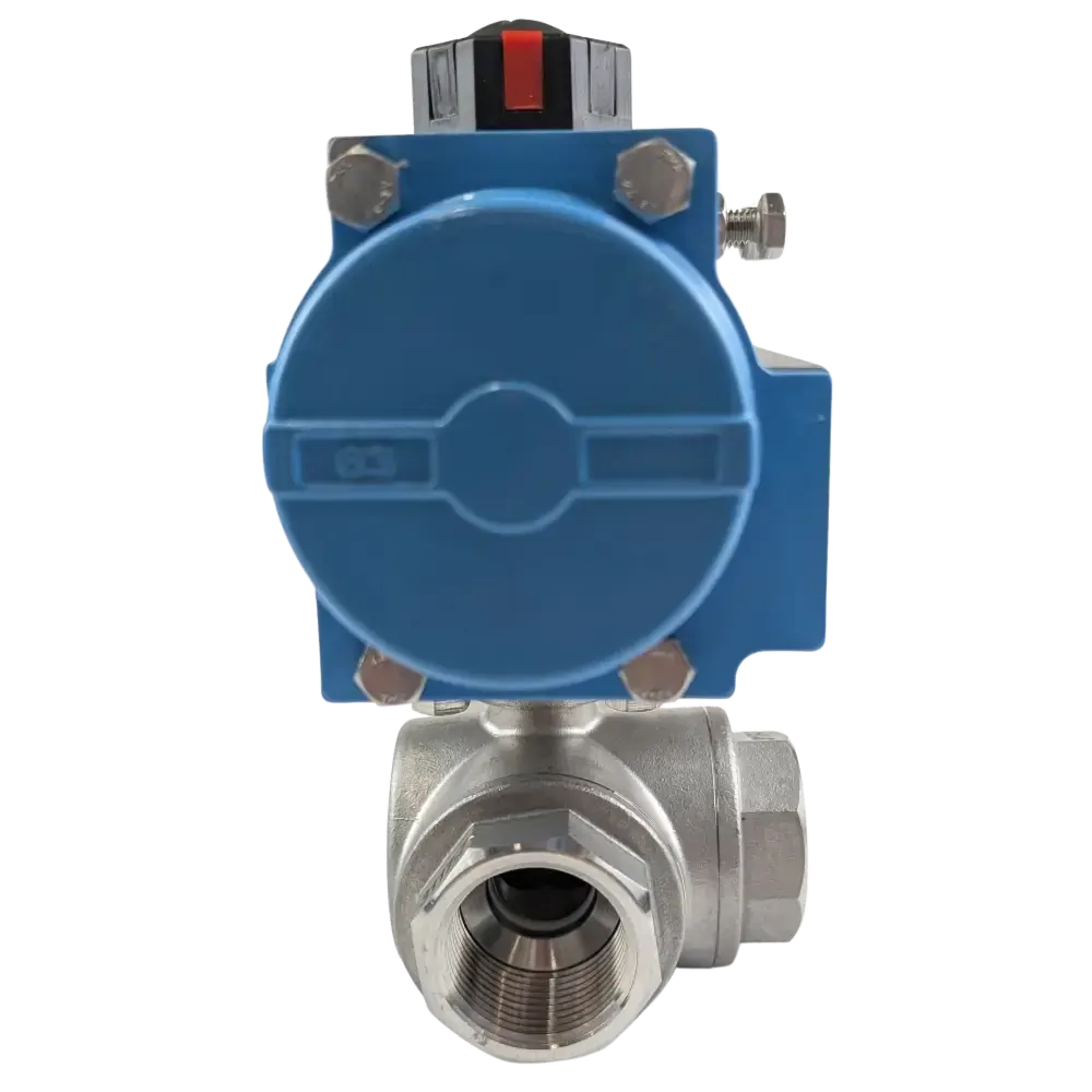 High performance 3 way (L and T port) reduced bore 316 Stainless Steel ball valve with BSP threaded connections and a double acting pneumatic actuator. Self adjusting stem packing assembly with Belleville spring for temperature fluctuations and vibration. Long neck to minimise any thermal transfer from valve to actuator. Reinforced PTFE seats for temperatures up to 180°C. Typical applications include water treatment, chemical, marine, petrochemical and general industry. Threads conform to ISO 7.1 Sealing Threads.